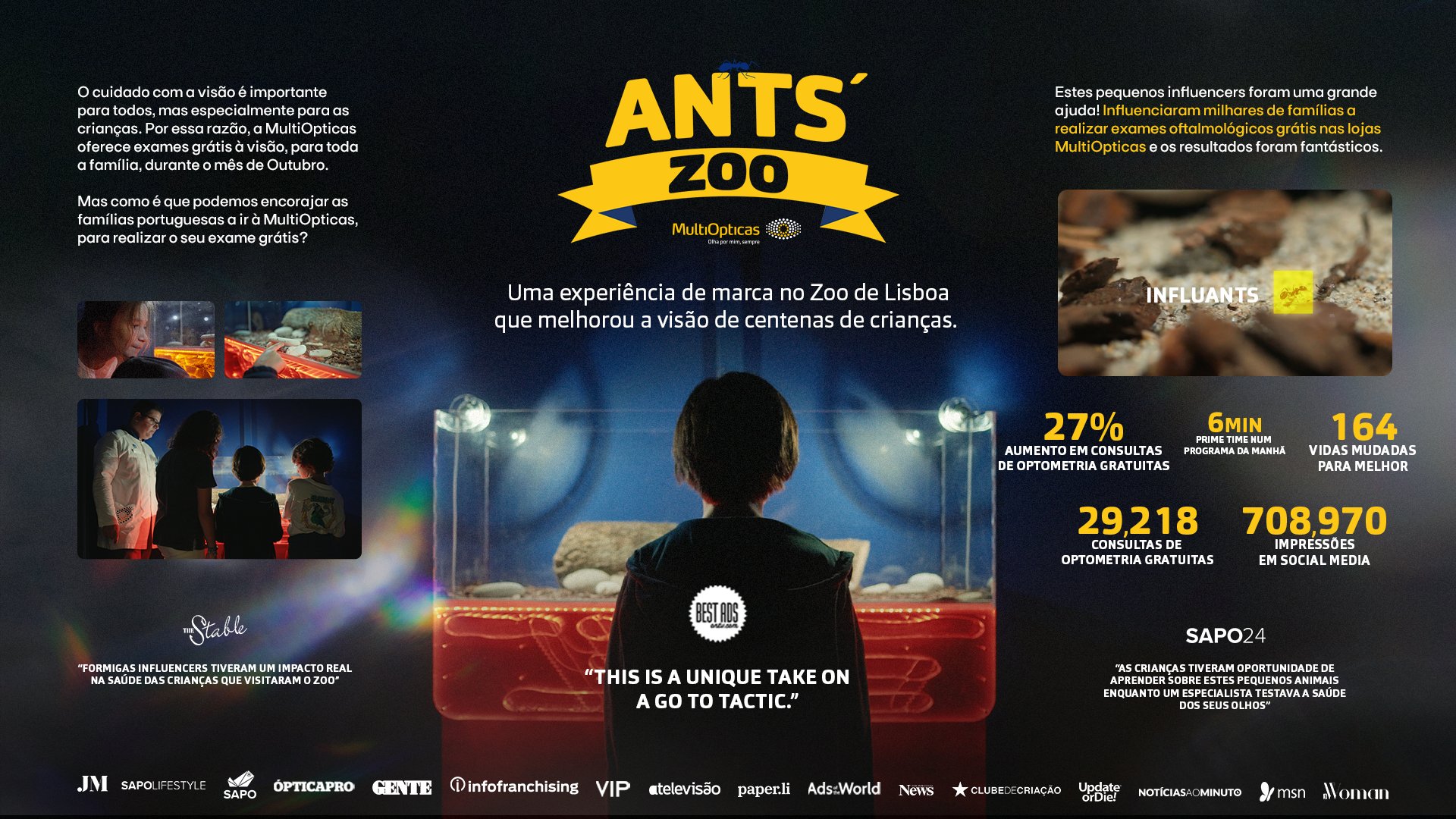 Criámos uma exposição em ambiente outdoor, uma instalação no Jardim Zoológico de Lisboa: O Zoo das Formigas. Uma iniciativa que utilizava formigas para identificar quais crianças precisavam de óculos. A dinâmica tinha o acompanhamento de especialistas que, após observarem o comportamento dos visitantes, direcionavam as crianças para outra parte da experiência, onde realizavam um exame mais aprofundado para saber se realmente precisavam de óculos. A instalação durou 3 semanas e recebeu milhares de visitantes.