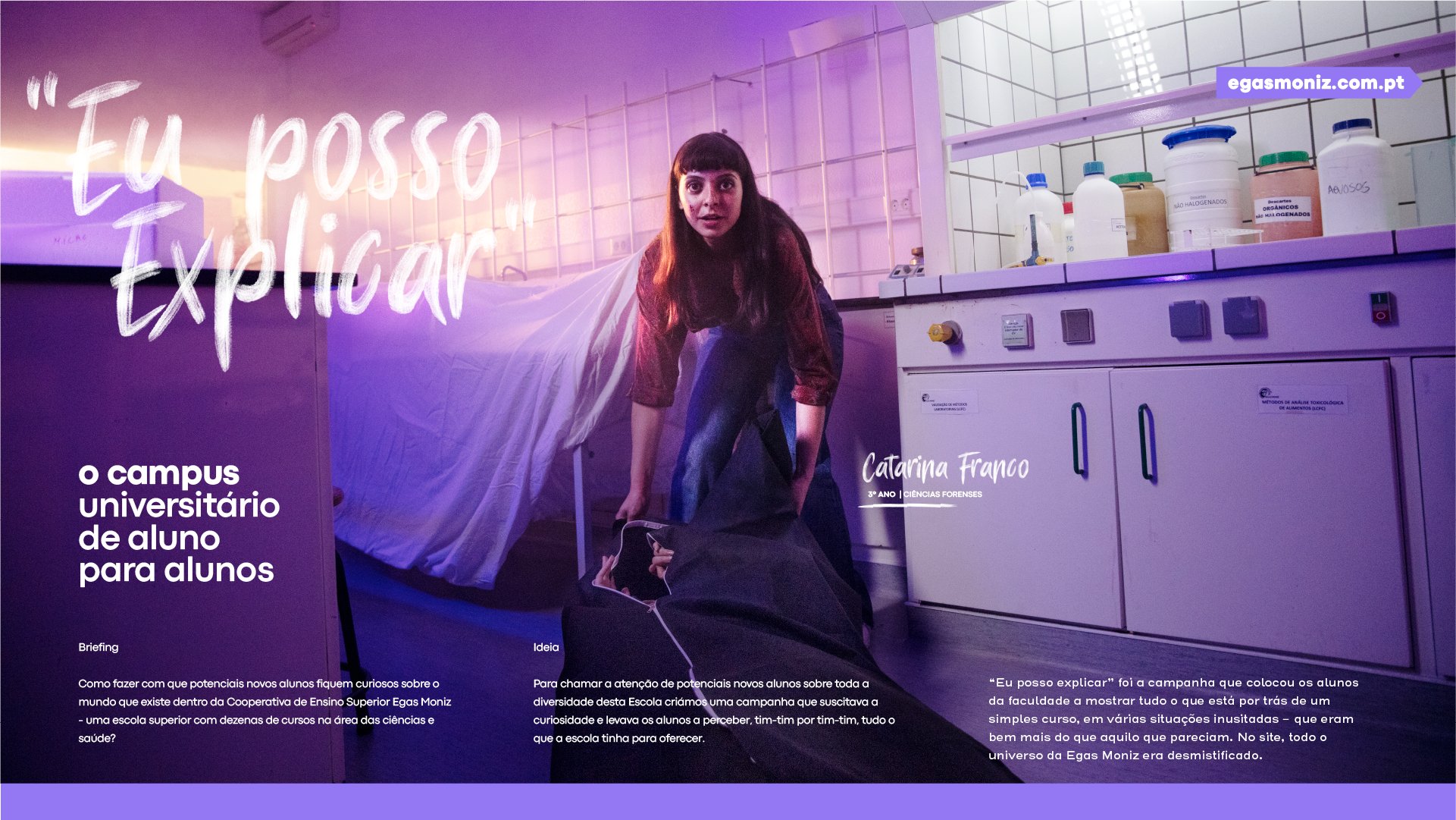 Para chamar a atenção de potenciais novos alunos sobre toda a diversidade desta Escola criámos uma campanha que suscitava a curiosidade e levava os alunos a perceber, tim-tim por tim-tim, tudo o que a escola tinha para oferecer. “Eu posso explicar” foi a campanha que colocou os alunos da faculdade a mostrar tudo o que está por trás de um simples curso, em várias situações inusitadas - que eram bem mais do que aquilo que pareciam. No site, todo o universo da Egas Moniz era desmistificado.