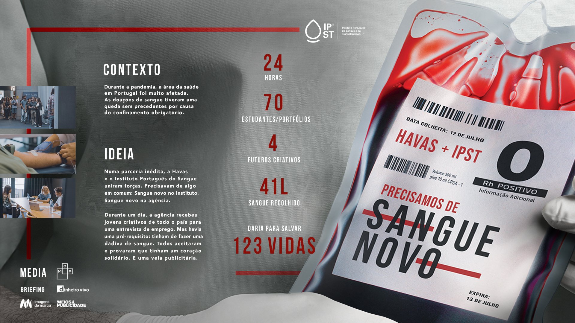 A pandemia afetou duramente a área da Saúde em Portugal. Mais concretamente, por culpa dos confinamentos obrigatórios, as pessoas iam muito menos vezes fazer doações de sangue e os bancos de sangue começavam a ficar vazios. Foram feitos vários apelos na comunicação social, com vista a ajudar a resolver o problema. Como podia uma agência de publicidade ajudar o Instituto Português do Sangue e da Transplantação e contribuir para a renovação dos seus stocks de sangue?