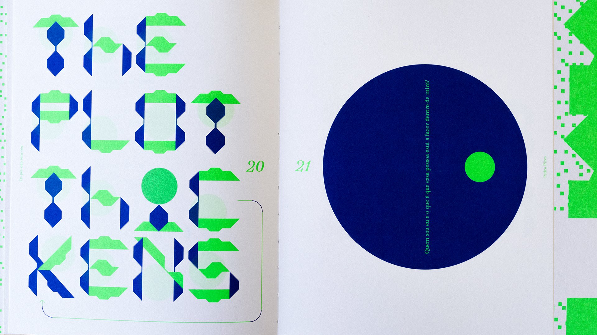Um poema pode ser olhado, para lá de lido. Neste livro vemos letras pela sua forma e potencial narrativo. Começa pela interpretação visual do título, na capa. A imagem desconstruída de um chão, no qual cai uma perfeita gota de céu verde na procura do outro. Daí nasce o tipo de letra 26 Céus, na procura da fronteira da legibilidade encontra identidade visual e dá corpo aos títulos dos poemas. O texto é tratado sem intenção de desenhar, mas sim de criar ritmo, que dialoga com o do próprio texto. O livro é táctil, tem pele, é bom de ser tocado. Este livro não é sobre poesia gráfica, mas dá ao design espaço ao lado das palavras. Acrescenta uma camada de conteúdos visuais – tipografias, simbologias, imagens - que vão dialogar com o conteúdo verbal, gerando novas possibilidades de interpretação.