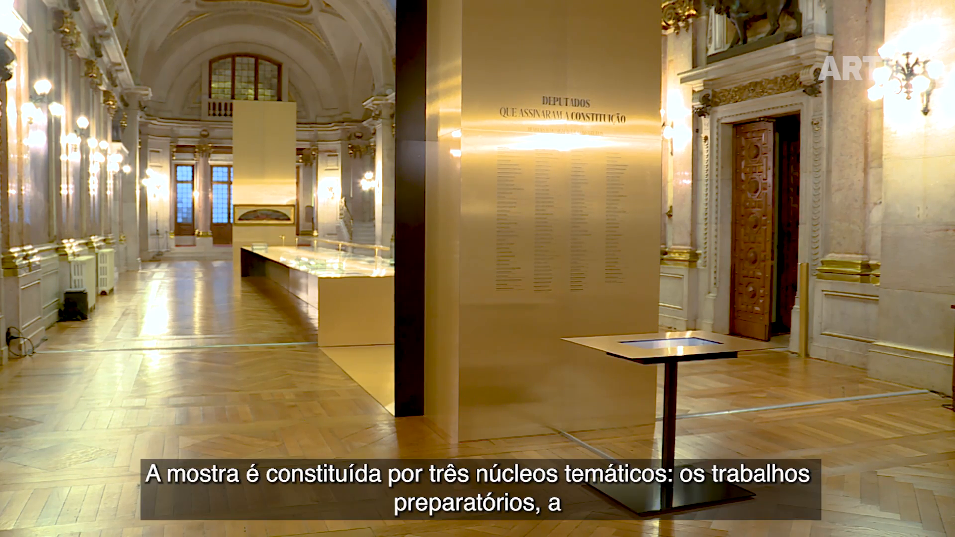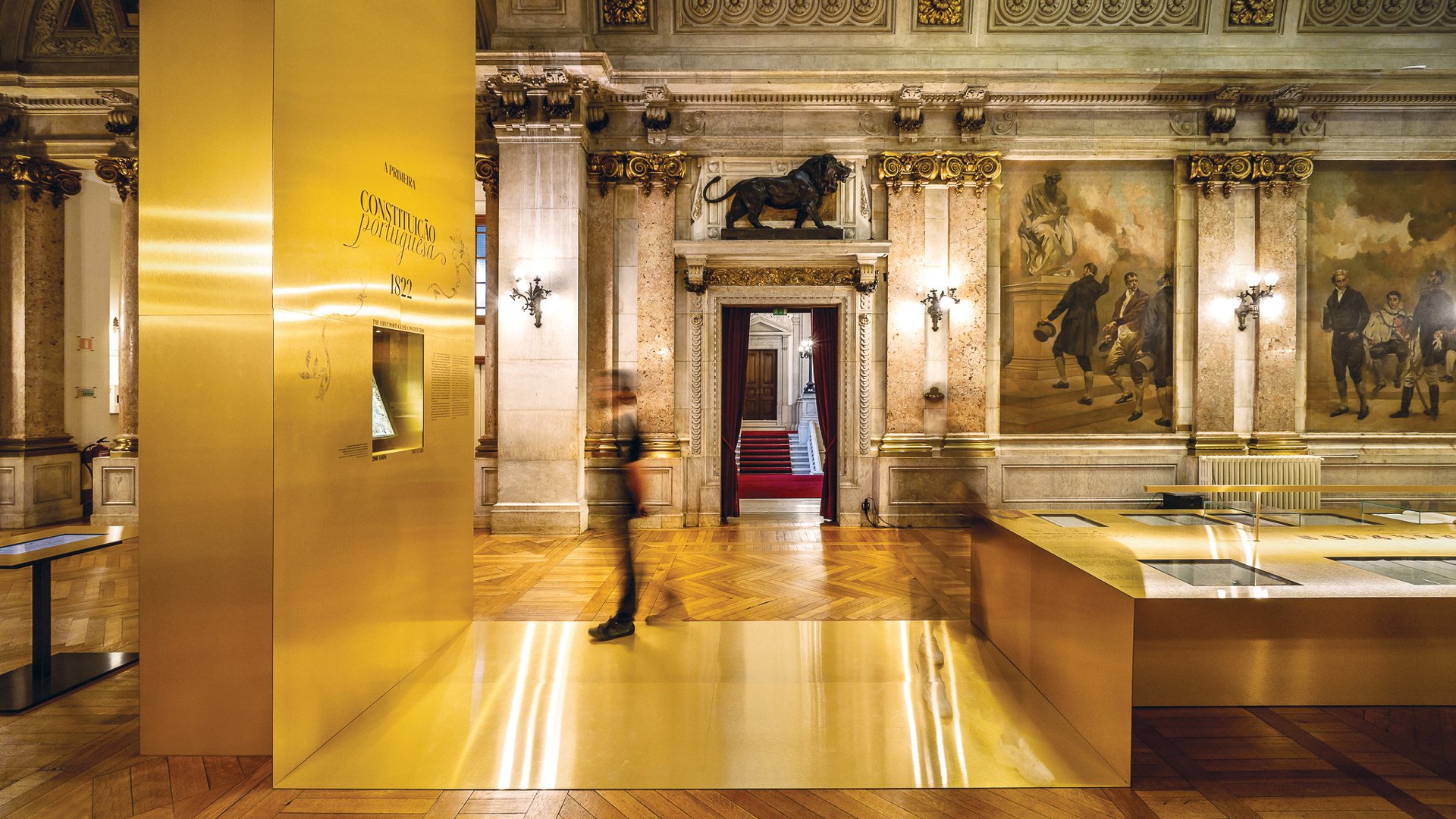 A exposição apresenta-se com dois enormes planos verticais e um plano horizontal ligados por uma enorme folha dourada que percorre a sala, apresentando uma coleção de documentos dedicados à Constituição de 1822. A folha metálica dourada, liga a exposição aos elementos decorativos da sala, refletindo o ambiente envolvente e tonalizando o espaço com um brilho dourado. Nos planos verticais, com intenção de destacar as peças principais da mostra documental, são expostas, frente a frente, a Constituição Portuguesa de 1822 e o estudo para a tela “As Cortes Constituintes de 1821” sobre a tela posicionada na luneta da sala das Sessões. No plano horizontal a exposição é dividida em 3 grandes núcleos, “Trabalhos preparatórios”, “A Constituição de 1822” e “Artigos inovadores na Constituição de 1822”.