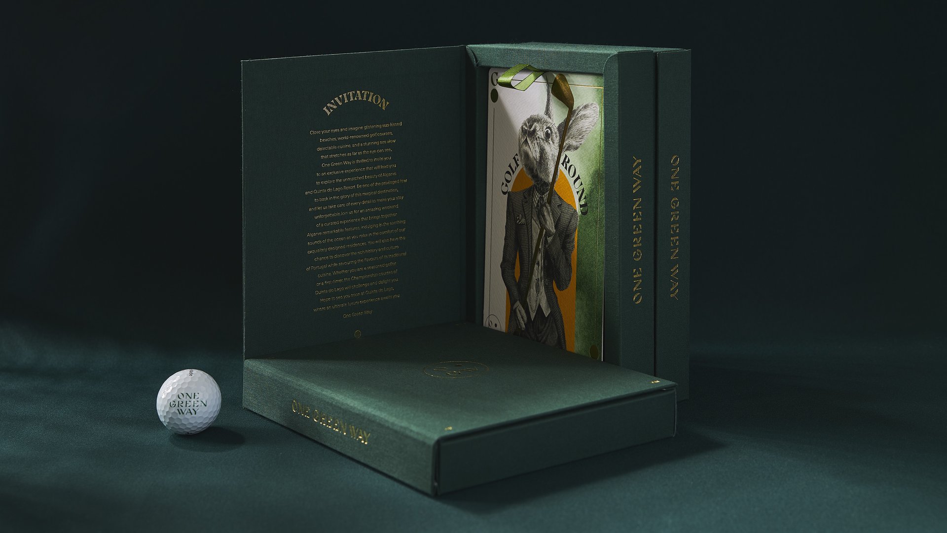 Com o intuito de atrair e seduzir potenciais investidores, convidámos os presentes no evento a visitar Portugal, ao oferecer um kit de experiências exclusivas na Quinta do Lago, durante um fim-de-semana. Para esse efeito foi criado um gift box com um convite premium, oferecido durante o jantar no Annabel's. Um clube com uma decoração e ambiente inebriante, exótico e elegante. Onde o exagero de ornamentação inspirado em padrões florais num estilo vintage, invade texturas e animais inusitados por todos os espaços do clube. A nossa linguagem gráfica cruza precisamente o ambiente do clube Annabel's com a identidade One Green Way. Num tom luxurioso, “nonsense” e artístico ilustrámos cartas com os temas de cada experiência oferecida.