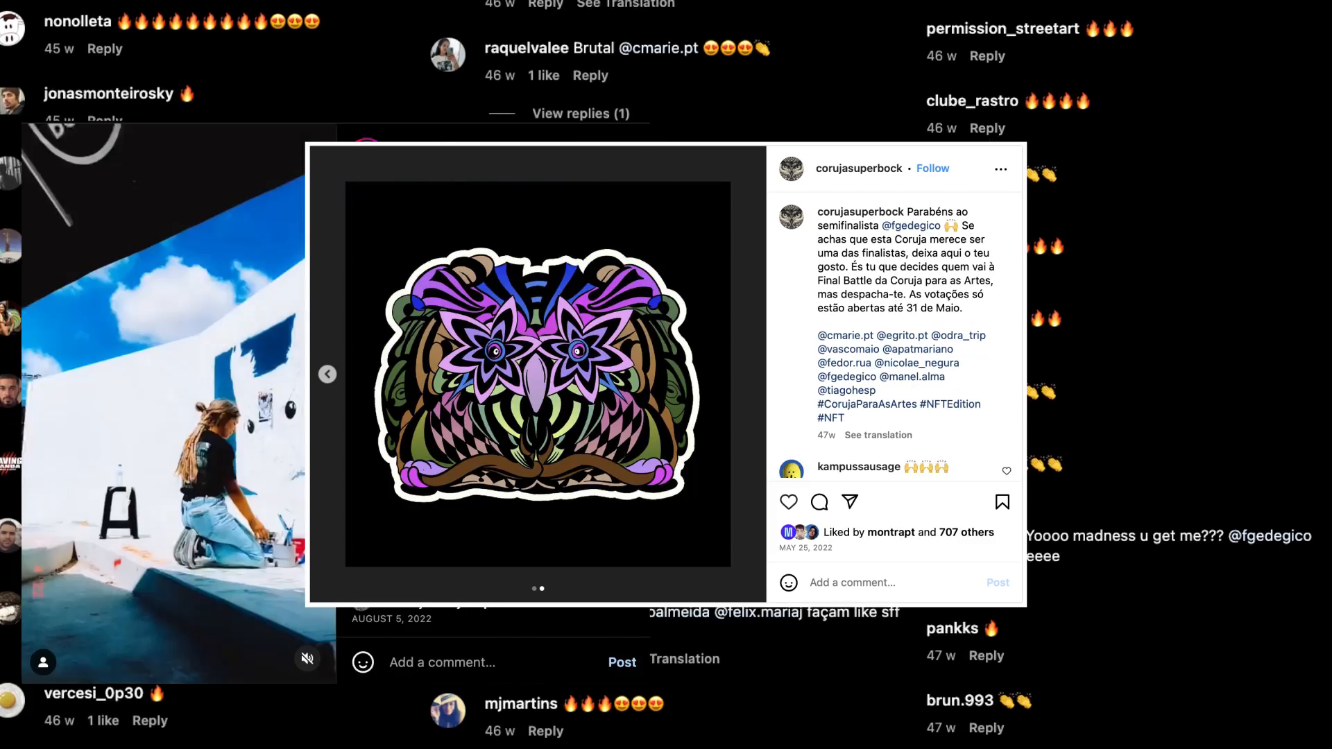 Criamos um open call a artistas para entregarem sua melhor versão de um “DESENHO DE CORUJA”. Recebemos mais de 100 designs OWL, dos quais escolhemos os 9 semifinalistas que seriam colocados em votação pública no Instagram.Estes teriam a oportunidade de criar NFT´s num drop totalmente apoiado pela marca, cujos lucros iriam integralmente para os artistas iria direto para os artistasUma dinâmica sem precedentes começou no digital. Cada base de fãs de artistas começou a votar e comentar como nunca antes.Seguiu-se a batalha do graffiti no Parque de Arte de Rua da Coruja. Este ano, com o Drop, o CORUJA para as Artes continuou online dando visibilidade extra aos artistas e seus trabalhos.O primeiro lançamento de NFT feito por uma marca em Portugal.