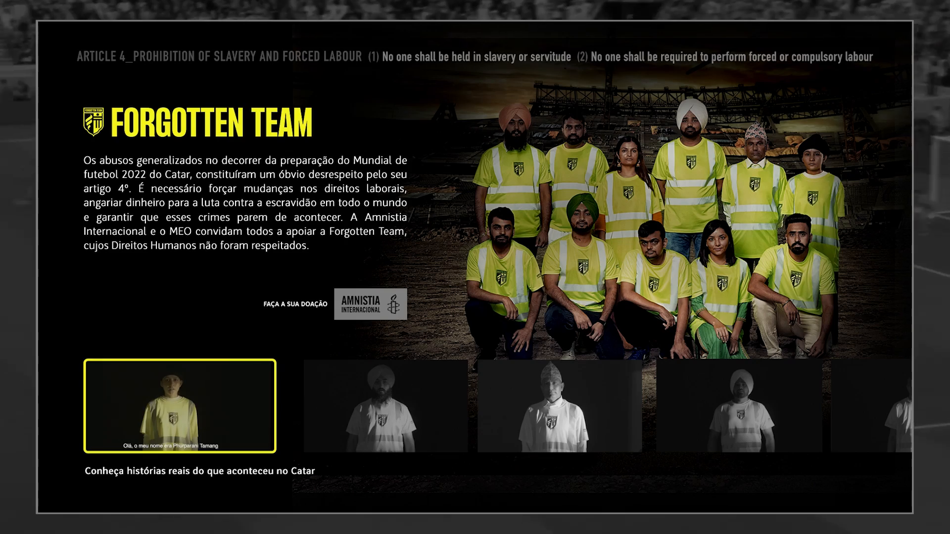 O MEO aliou-se à Amnistia Internacional e criou a Forgotten Team, uma equipa de futebol em tributo aos milhares de trabalhadores migrantes que deram as suas vidas pelo Campeonato do Mundo no Qatar. A camisola era inspirada nos coletes amarelos dos trabalhadores e tinha nas costas o Artigo 4 do Human Rights Act: Liberdade de escravidão e trabalho forçado. A equipa queria angariar fundos para as famílias das vítimas e cativar o povo português, 10 milhões de apoiantes. Uma equipa para fãs de direitos humanos foi onde a MEO investiu os seus recursos durante o torneio. TV, mupis, ativações, embaixadores, até o botão amarelo dos comandos levava para a Forgotten Team. Quando as camisolas foram banidas à porta de um estádio, o país abraçou a equipa e tornou-a num símbolo de coragem e resiliência
